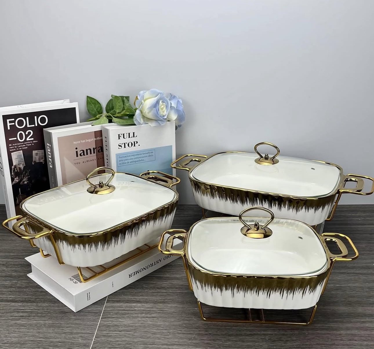 Tempered Glass Lids , Each dish includes a fitted transparent lid with a gold knob.