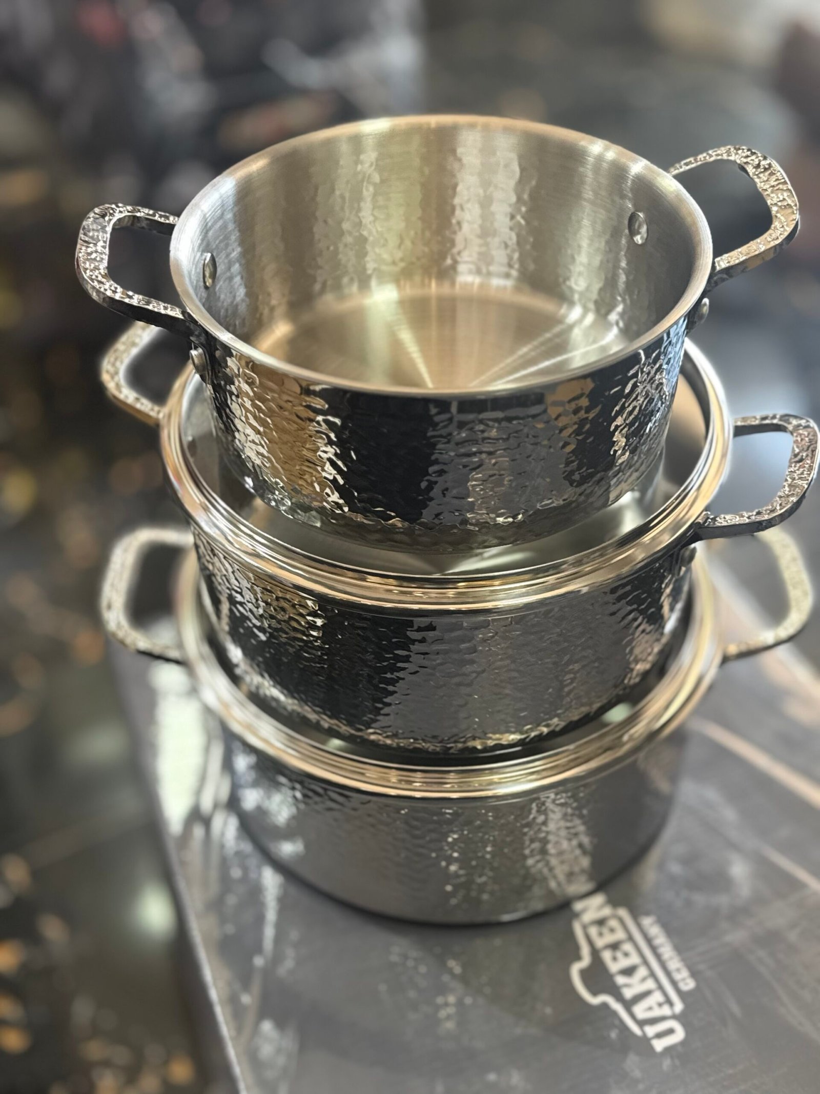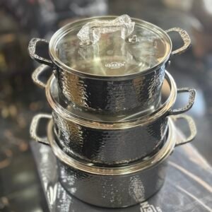 This high-quality hammered cookware set features strong construction, heat-efficient design, and glass lids for easy cooking control.